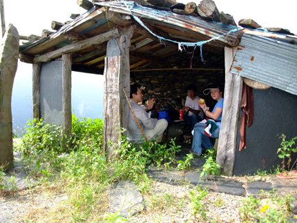 爬了三個多小時,早已飢腸轆轆,借有部落的石板屋,吃飯囉!
